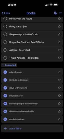 The primary way I manage reading is to maintain one very long recommendation list. Any time I get a recommendation that I might want to read some day I put it on the list. When it’s done I take it off the list. “Any time I get a recommendation” is pretty key. Everyone who reads loves talking about the books they’ve just read (I’m in a Slack channel at work that’s basically everyone bragging about their “just reads” :-)). If something seems marginally interesting at all, I put it on the list.